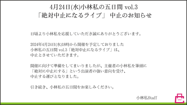 シンガーソングライターの小林私(こばやしわたし)が主催するライブ、『絶対に中止になるライブ』が中止となることが発表されました。