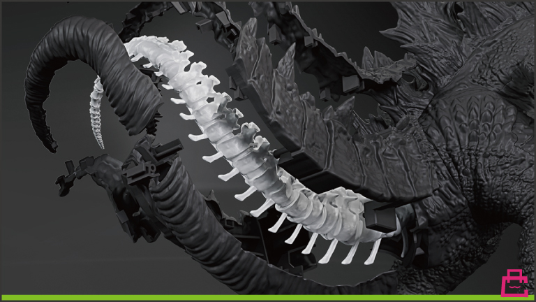 なんとゴジラの骨格!いや、ゴジラの化石!?25cm以上というサイズで、有機的で綿密にデザインされた外皮とセットなので並べて飾ることができます。