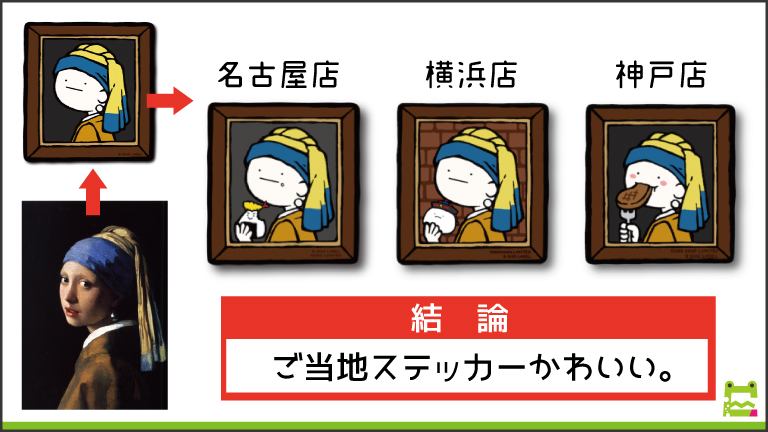 ↑上の写真はフェルメールの代表作『真珠の耳飾りの少女』パロディのステッカーからの、派生ご当地デザイン。地域限定に加えwebショップ限定もある。揃えたくなるー!