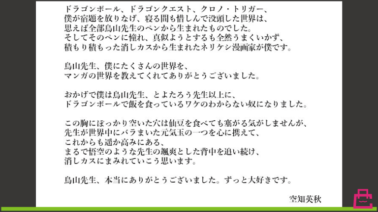 ドラゴンボールのパロディネタを多く扱ってきた空知氏。彼の個性的な語彙力全開の追悼メッセージが発表された。